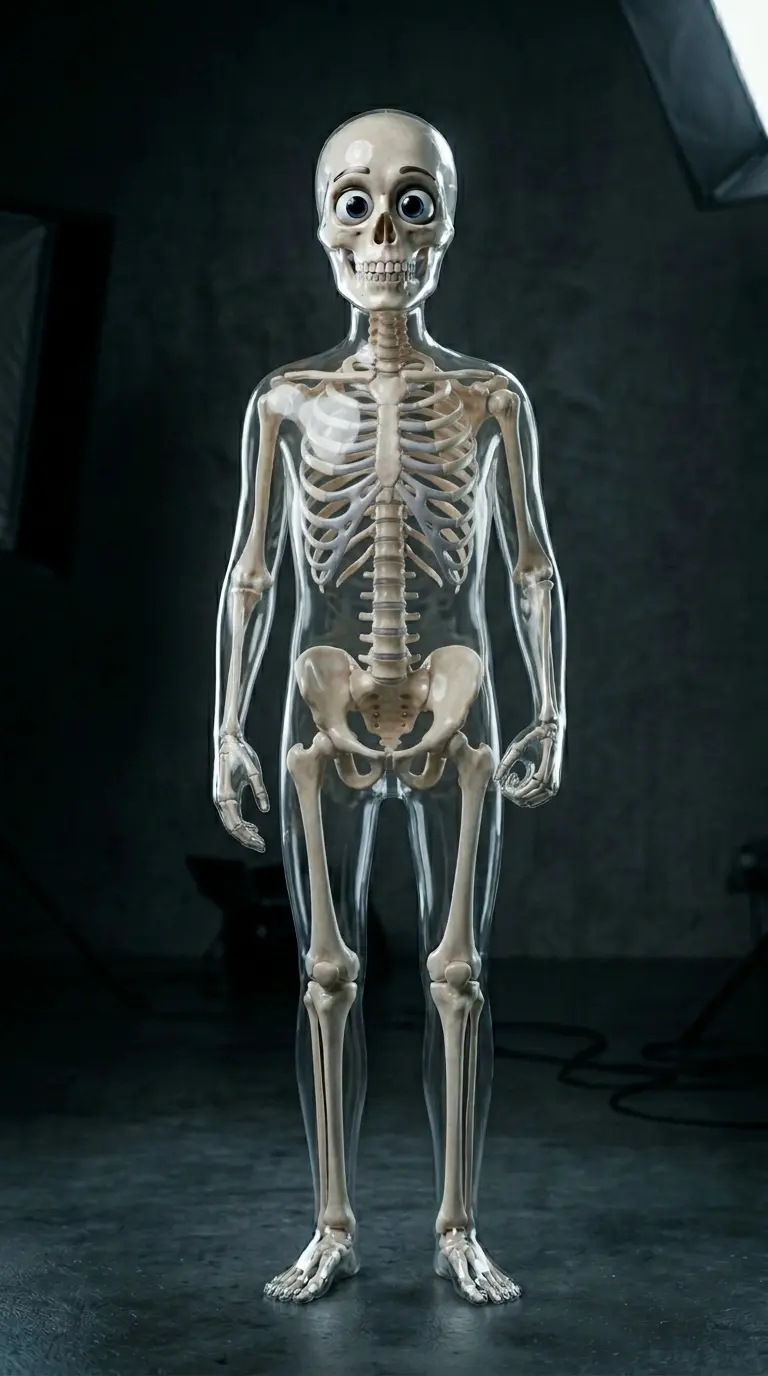 glassy bones, transparent bones, crystal skeleton, horror, gore, scary face, broken anatomy, extra limbs, duplicate characters, same outfit on all characters, cluttered background, unreadable text, low detail, blurry render, dark dirty lighting, copyrighted logo, branded shirt print