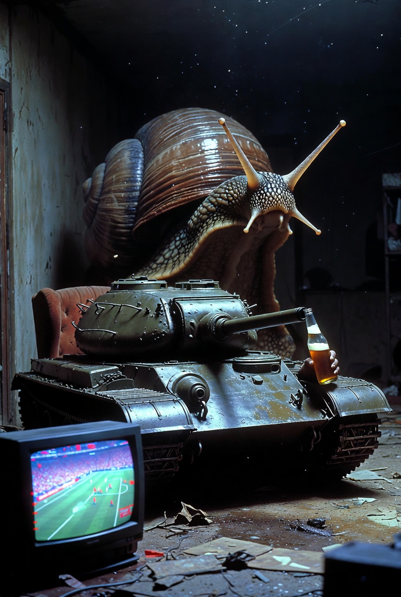 A dark, disturbing cinematic horror scene. A realistic battle tank inspired by War Thunder sits unnaturally in an old, torn armchair inside a decaying room. The tank moves slightly like a living creature, emitting low metallic creaks. It slowly drinks from a glass bottle of beer, but the liquid inside looks thick and unnatural. . Subtle camera movement, slow zoom in. Analog horror style, VHS distortion, film grain, flickering lights, heavy