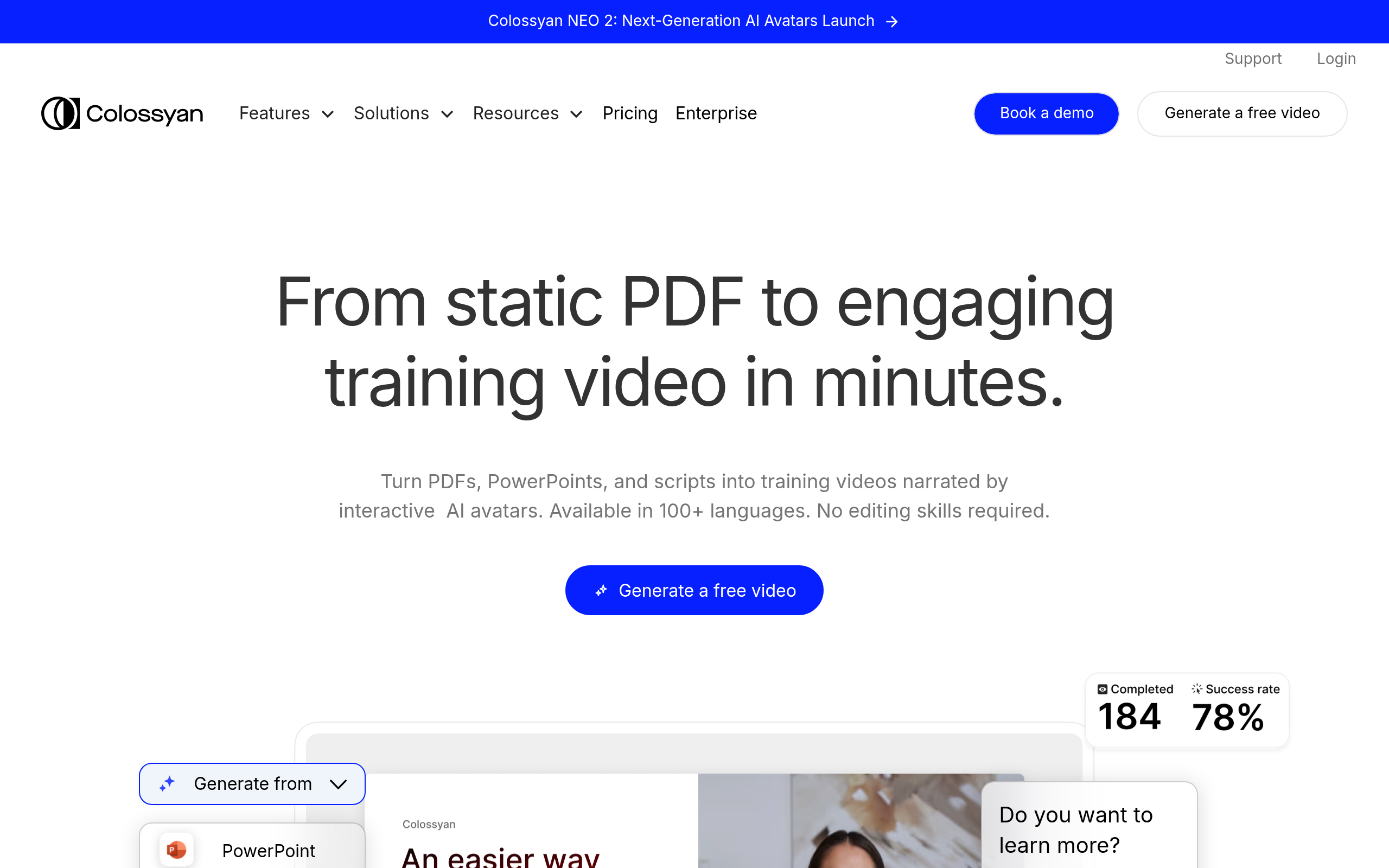 Colossyan подходит для быстрого создания видео с виртуальными ведущими на основе текста, особенно когда важна скорость и простота. Сервис удобен для маркетинга, обучения и презентаций, но не заменит полноценную видеосъемку при сложных задачах.